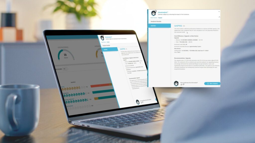 AlmaAnalysis™ is an advanced intelligent analysis module that utilizes AI technology to evaluate device experiences, identify upgrade or replacement needs, and analyze associated costs. This evolution represents a significant improvement over its initial version, which already provided device assessment capabilities. Now, the tool not only measures user experience but also offers strategic insights to optimize technology investments.